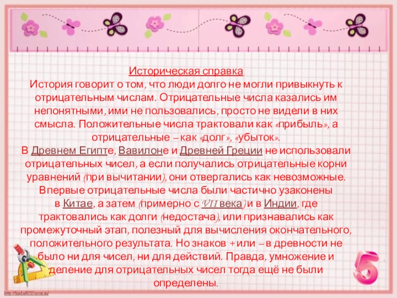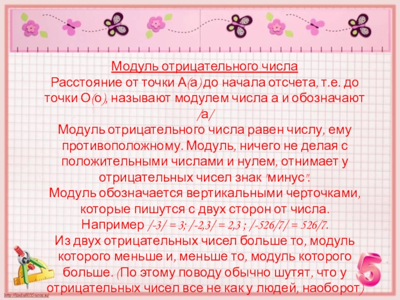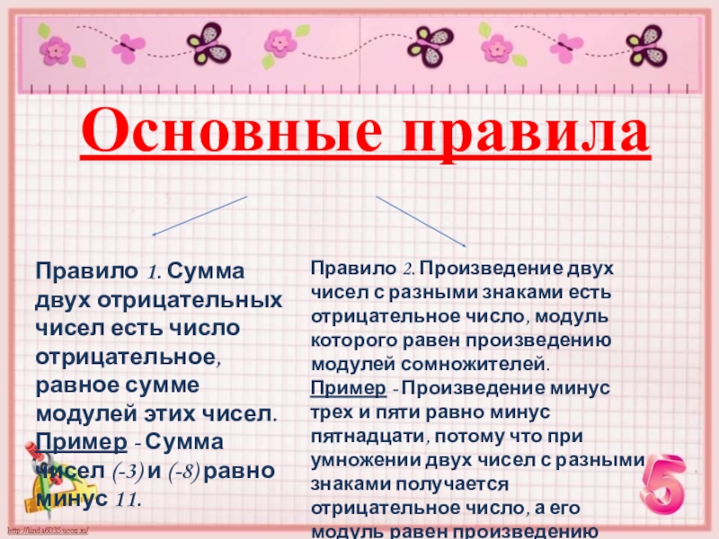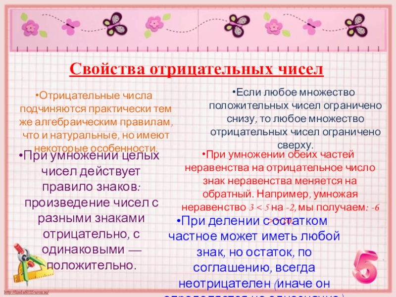 Отрицательные числа подчиняются практически тем же алгебраическим правилам, что и натуральные, но имеют некоторые особенности.
