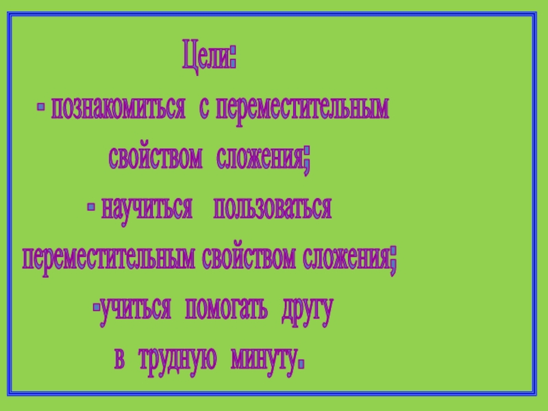 Цели: - познакомиться с переместительным свойством сложения;- научиться  пользоваться переместительным свойством сложения; -учиться помогать другу в
