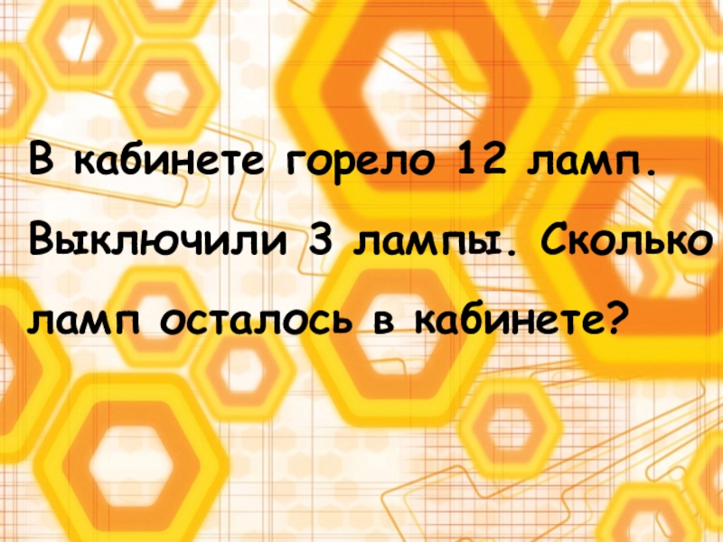 В кабинете горело 12 ламп. Выключили 3 лампы. Сколько ламп осталось в кабинете?