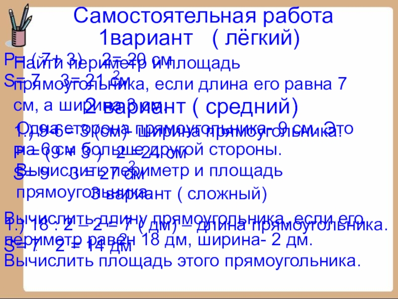 1.) 18 : 2 – 2 = 7 ( дм) – длина прямоугольника.