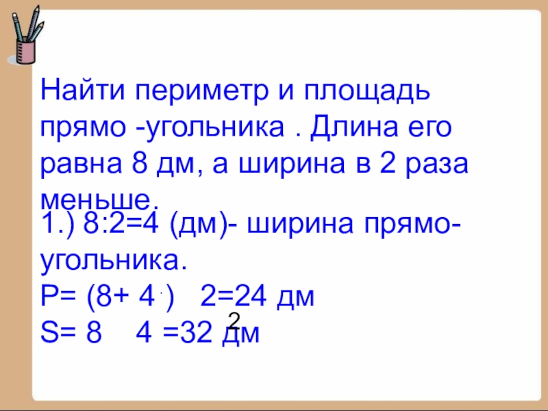 1.) 8:2=4 (дм)- ширина прямо-угольника.