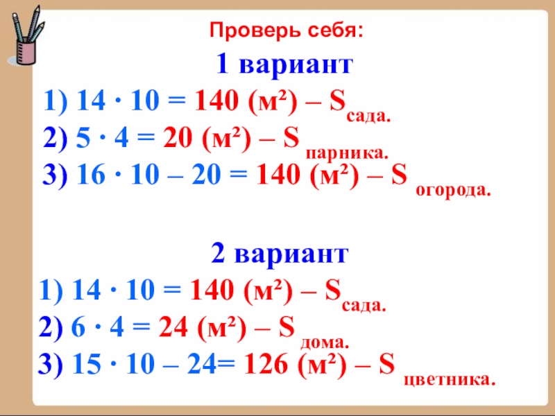 1) 14 ∙ 10 = 140 (м²) – Sсада.