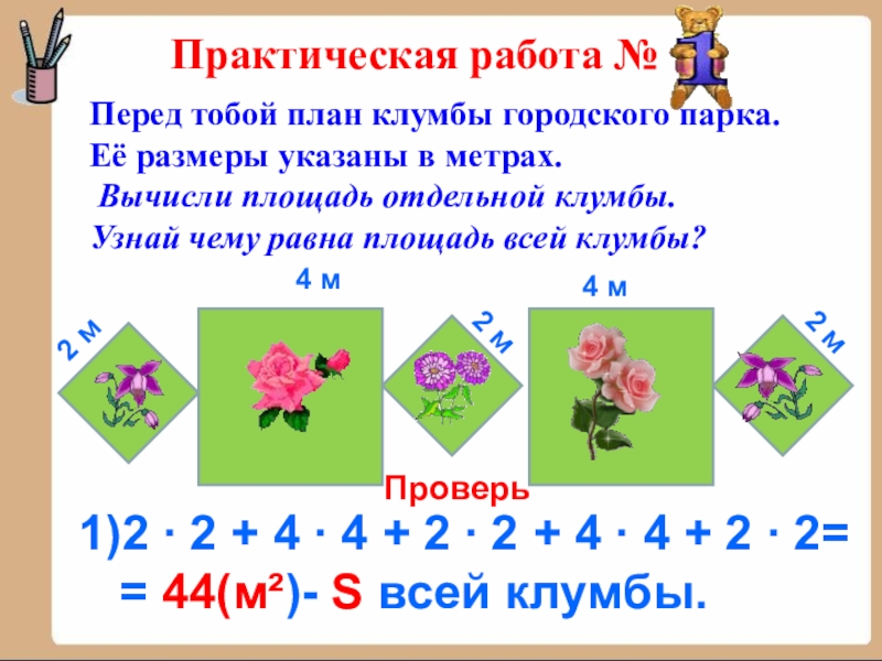 3) 15 ∙ 10 – 24= 126 (м²) – S цветника.