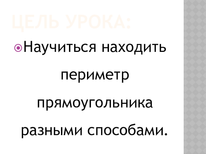 Цель урока:Научиться находить периметр прямоугольника разными способами.