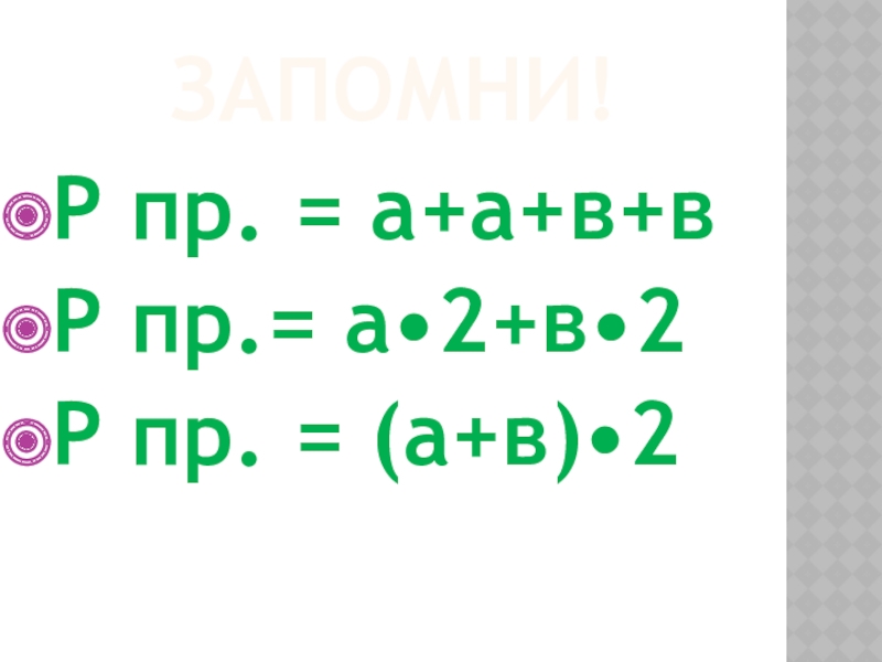 ЗАПОМНИ!Р пр. = а+а+в+вР пр.= а•2+в•2Р пр. = (а+в)•2