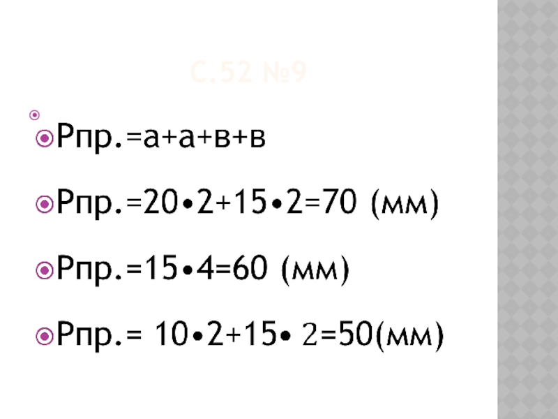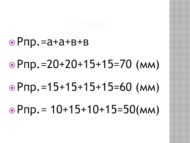 С.52 №9Рпр.=а+а+в+вРпр.=20+20+15+15=70 (мм)Рпр.=15+15+15+15=60 (мм)Рпр.= 10+15+10+15=50(мм)