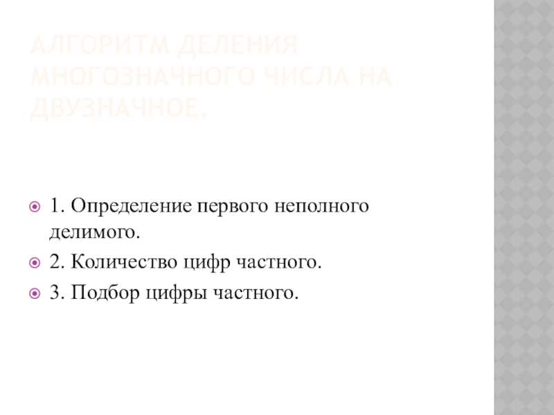 Алгоритм деления многозначного числа на двузначное. 1. Определение первого неполного делимого.2. Количество цифр частного.3. Подбор цифры частного.