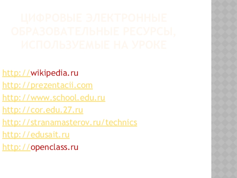 Цифровые электронные образовательные ресурсы, используемые на урокеhttp://wikipedia.ruhttp://prezentacii.comhttp://www.school.edu.ruhttp://cor.edu.27.ruhttp://stranamasterov.ru/technicshttp://edusait.ruhttp://openclass.ru