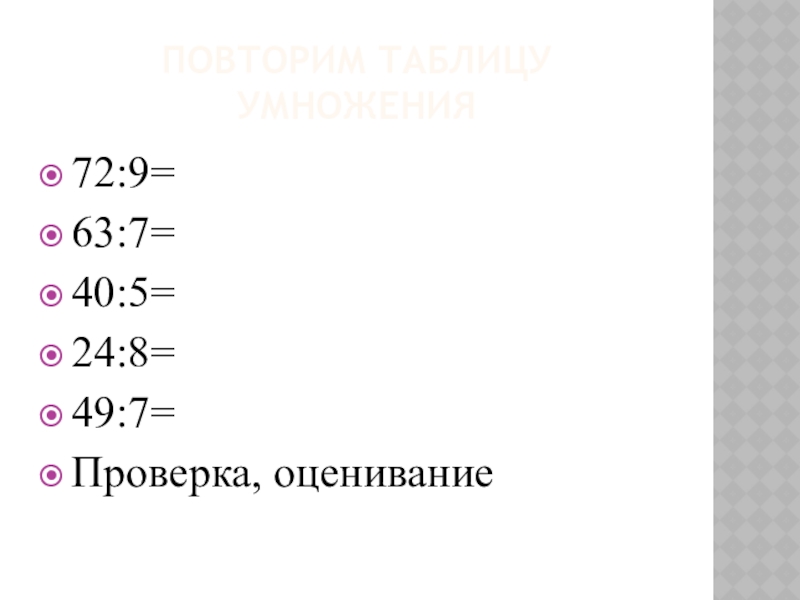 Повторим таблицу умножения72:9=63:7=40:5=24:8=49:7=Проверка, оценивание