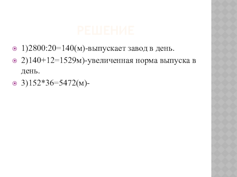 Решение1)2800:20=140(м)-выпускает завод в день.2)140+12=1529м)-увеличенная норма выпуска в день.3)152*36=5472(м)-