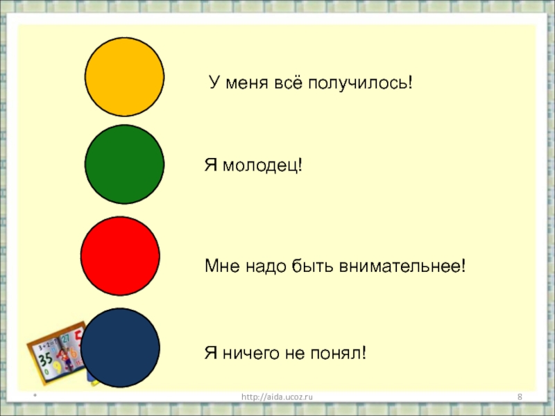 *http://aida.ucoz.ruУ меня всё получилось!Я молодец!Мне надо быть внимательнее!Я ничего не понял!