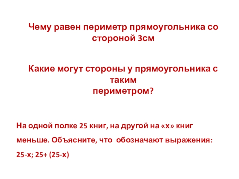 На одной полке 25 книг, на другой на «х» книг меньше. Объясните, что обозначают выражения: 25-х; 25+ (25-х)