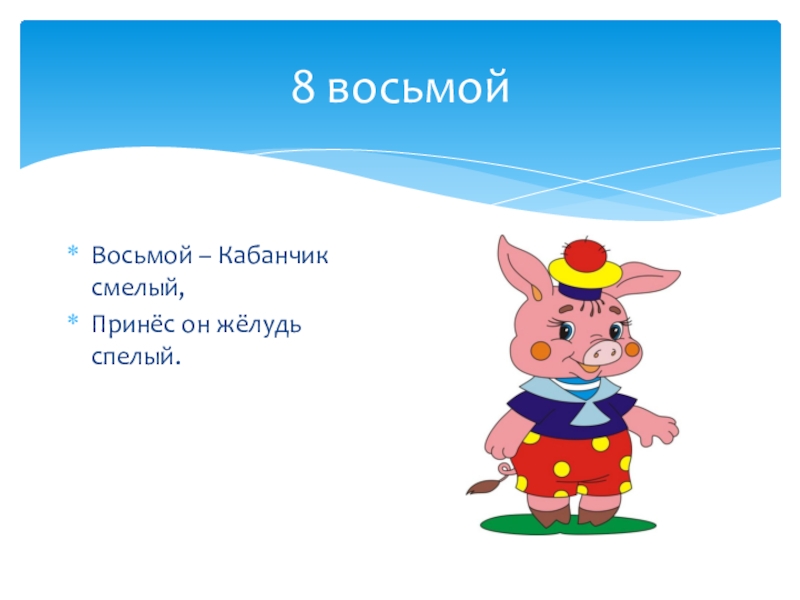 8 восьмойВосьмой – Кабанчик смелый,Принёс он жёлудь спелый.
