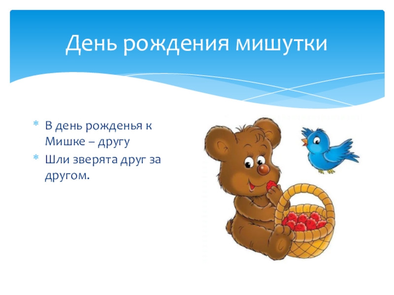 День рождения мишуткиВ день рожденья к Мишке – другуШли зверята друг за другом.
