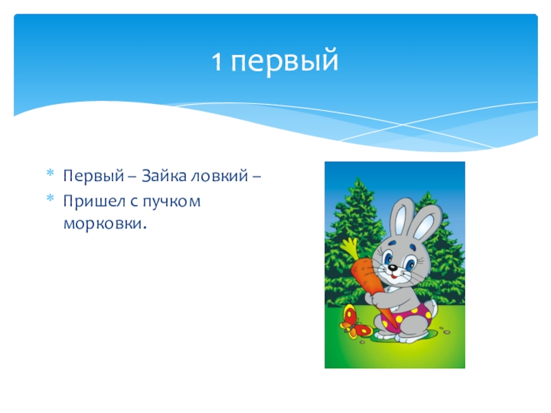 1 первыйПервый – Зайка ловкий – Пришел с пучком морковки.