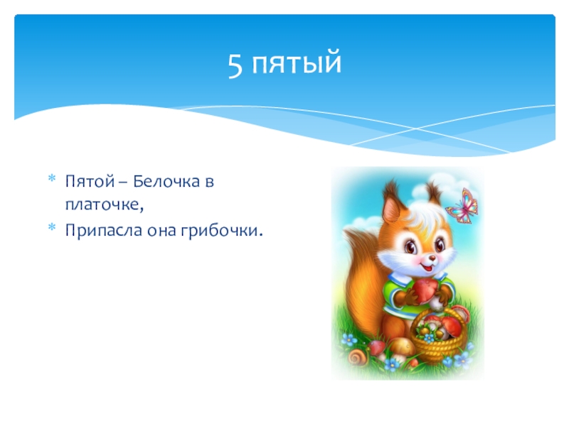 5 пятыйПятой – Белочка в платочке,Припасла она грибочки.