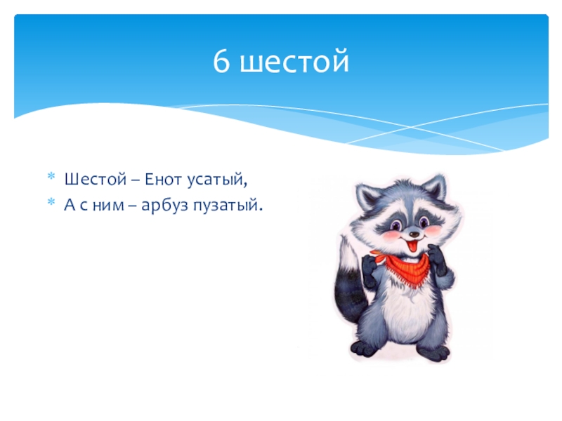6 шестойШестой – Енот усатый,А с ним – арбуз пузатый.