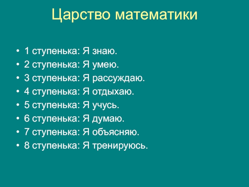 Царство математики 1 ступенька: Я знаю.2 ступенька: Я умею.3 ступенька: Я рассуждаю.4 ступенька: Я отдыхаю.5 ступенька: Я учусь.6 ступенька: Я думаю.7 ступенька: Я объясняю.8 ступенька: Я тренируюсь.