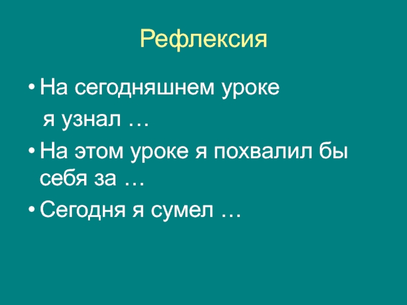 РефлексияНа сегодняшнем уроке  я узнал …На этом уроке я похвалил бы себя за …Сегодня я сумел