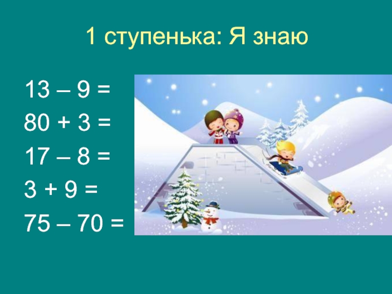 1 ступенька: Я знаю13 – 9 =80 + 3 =17 – 8 =3 + 9 =75 –