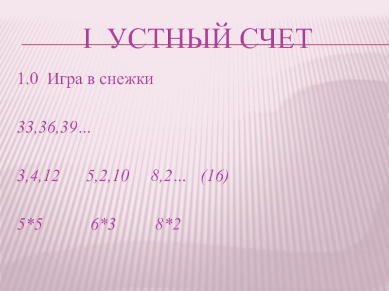 I Устный счет1.0 Игра в снежки33,36,39…3,4,12 5,2,10 8,2… (16)5*5 6*3 8*2