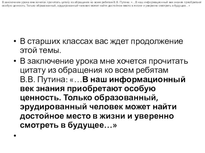 В заключение урока мне хочется прочитать цитату из обращения ко всем ребятам В.В. Путина: «…В наш информационный век знания приобретают особую ценность. Только образованный, эрудированный человек может найти достойное место в жизни и уверенно смотреть в будущее…»