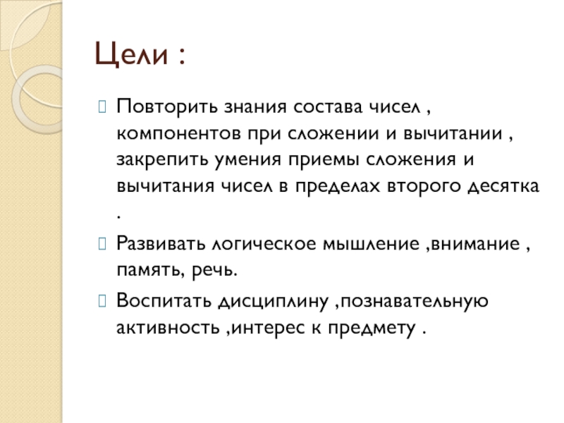 Цели :Повторить знания состава чисел , компонентов при сложении и вычитании ,закрепить умения приемы сложения и вычитания чисел в пределах второго десятка .Развивать логическое мышление ,внимание , память, речь.Воспитать дисциплину ,познавательную активность ,интерес к предмету .