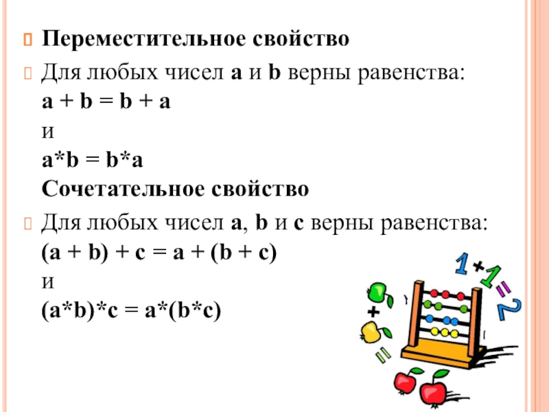 Переместительное свойствоДля любых чисел a и b верны равенства:  a + b = b + a