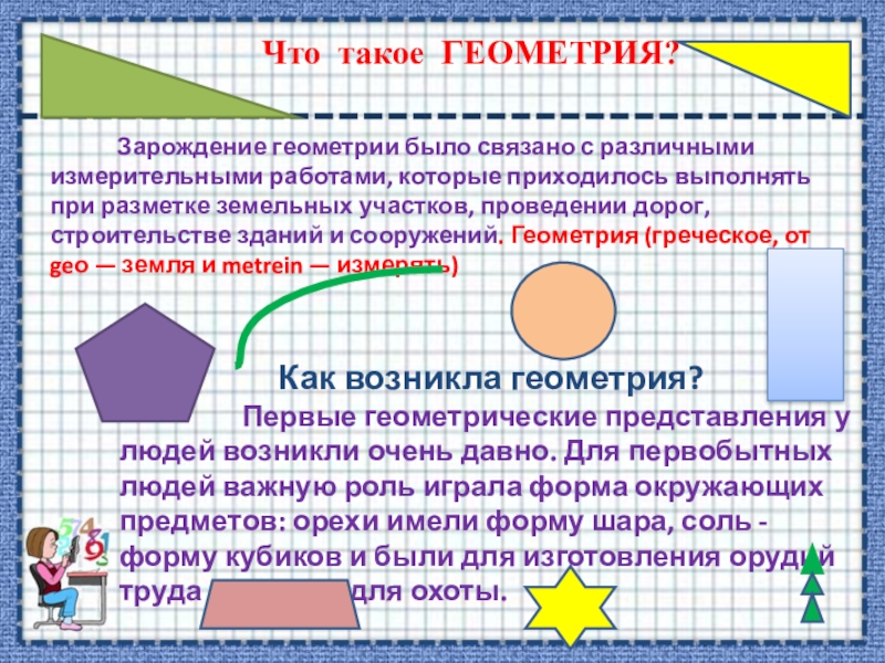 Первые геометрические представления у людей возникли очень давно. Для первобытных людей важную роль играла форма окружающих предметов: орехи имели форму шара, соль - форму кубиков и были для изготовления орудий труда и оружия для охоты.