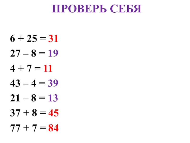 ПРОВЕРЬ СЕБЯ6 + 25 = 3127 – 8 = 19 4 + 7 = 1143 – 4