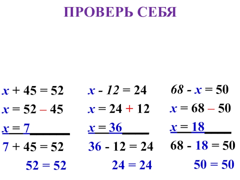 ПРОВЕРЬ СЕБЯх + 45 = 52х = 52 – 45х = 7______7 + 45 = 52