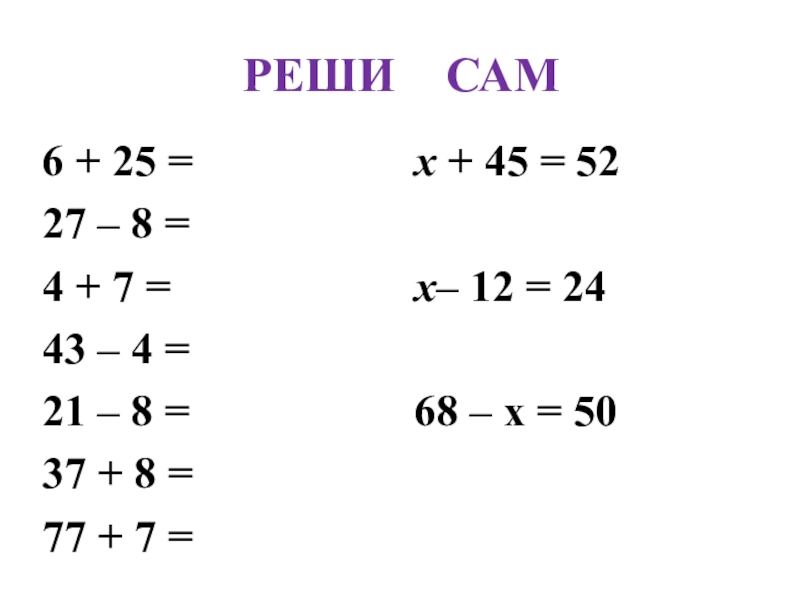 РЕШИ  САМ6 + 25 =27 – 8 = 4 + 7 = 43 – 4 =