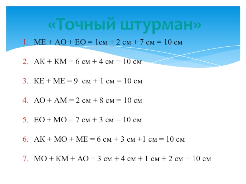 «Точный штурман»МЕ + АО + ЕО = 1см + 2 см + 7 см = 10 смАК