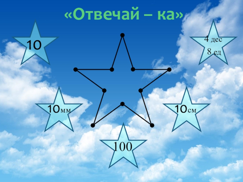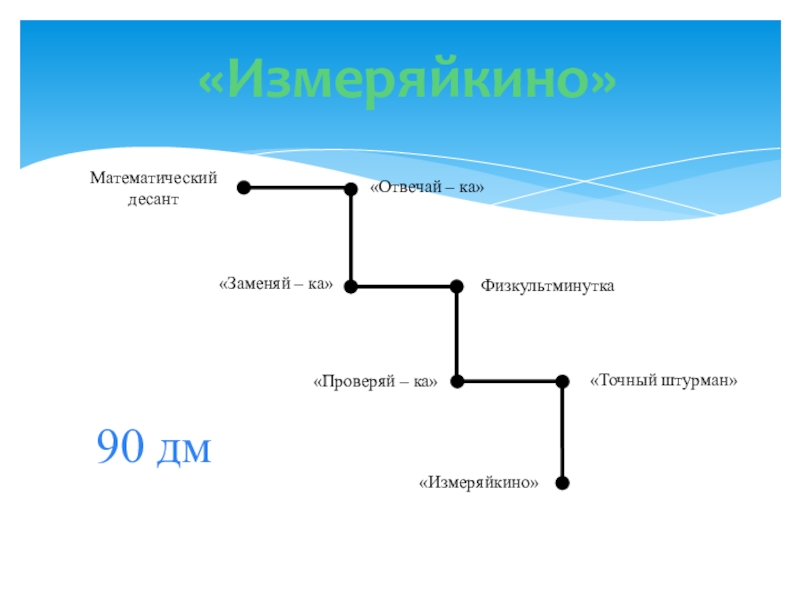 «Измеряйкино»Математический десант«Отвечай – ка»«Заменяй – ка»Физкультминутка«Проверяй – ка»«Точный штурман»«Измеряйкино»90 дм