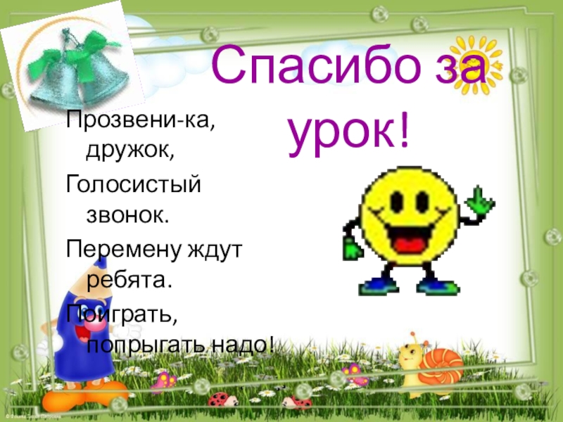 Спасибо за урок!Прозвени-ка, дружок,Голосистый звонок.Перемену ждут ребята.Поиграть, попрыгать надо!