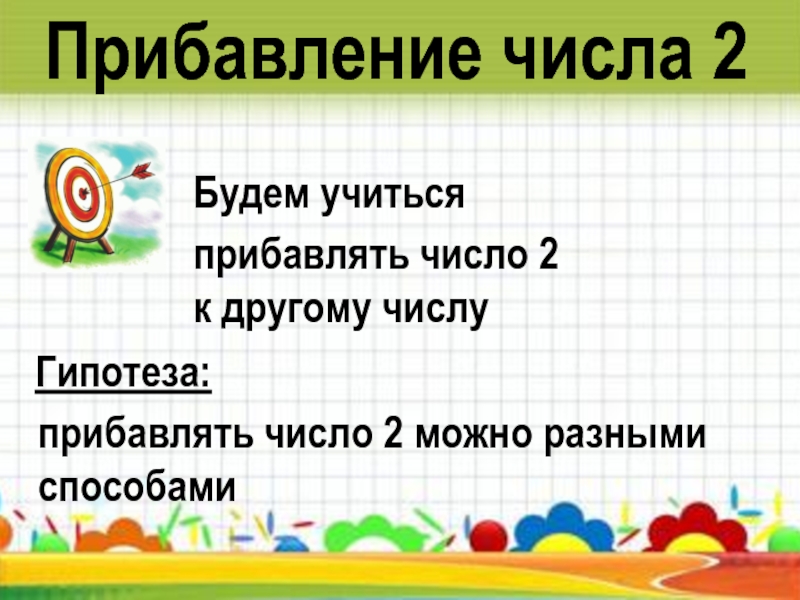 Прибавление числа 2Будем учитьсяприбавлять число 2 к другому числуГипотеза:прибавлять число 2 можно разными способами