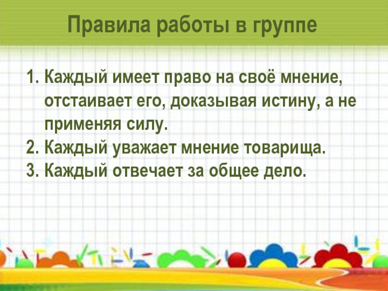 Правила работы в группеКаждый имеет право на своё мнение, отстаивает его, доказывая истину, а не применяя силу.Каждый