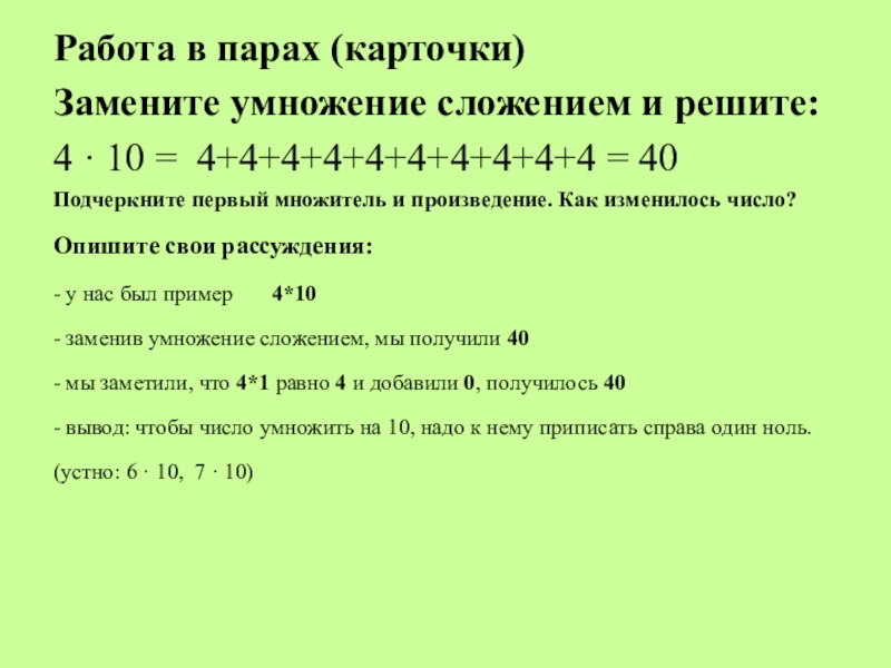 Работа в парах (карточки)   Замените умножение сложением и решите: 4 · 10 = 4+4+4+4+4+4+4+4+4+4 =