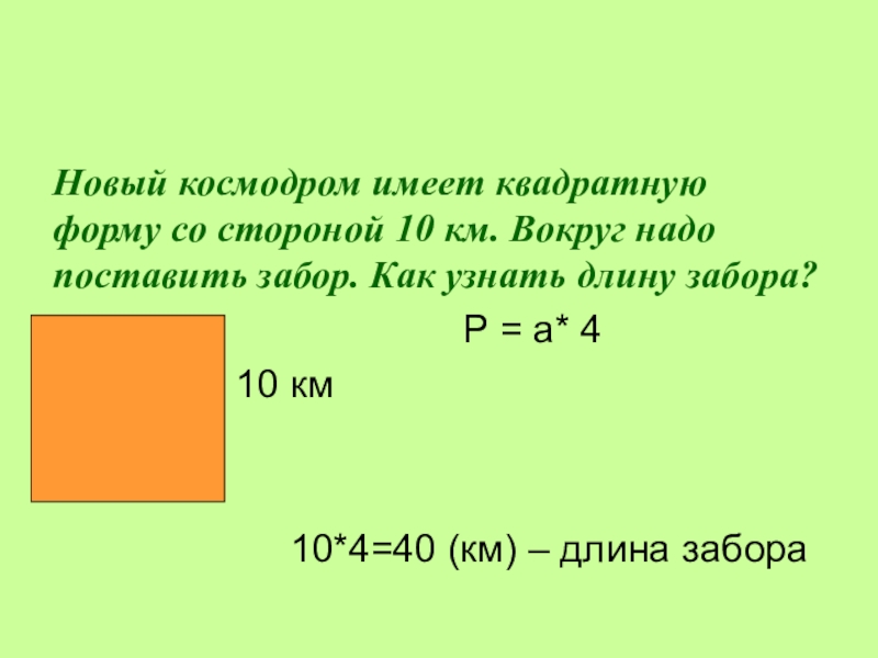Новый космодром имеет квадратную форму со стороной 10 км. Вокруг надо поставить забор. Как узнать длину забора?