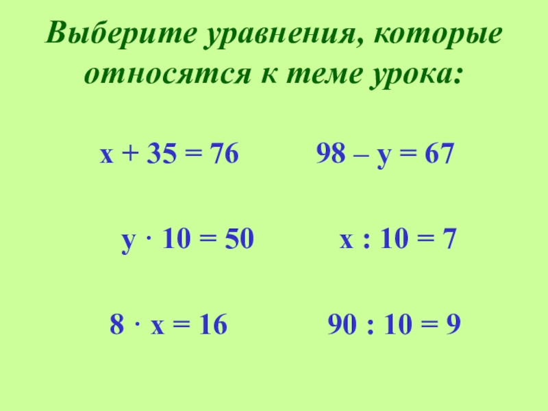 Выберите уравнения, которые относятся к теме урока: х + 35 = 76     98