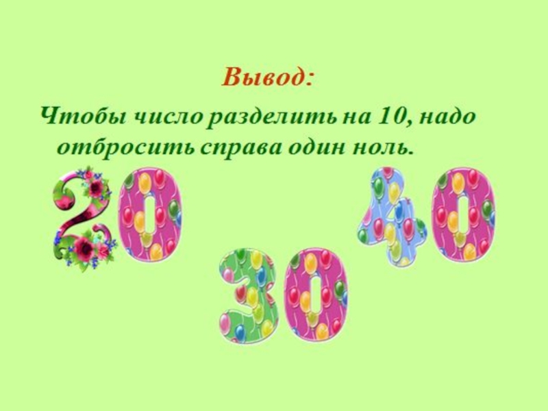 - вывод: чтобы число умножить на 10, надо к нему приписать справа один ноль.