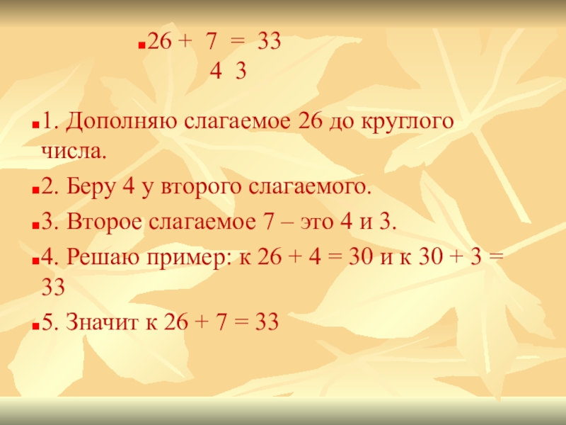 4. Решаю пример: к 26 + 4 = 30 и к 30 + 3 = 33