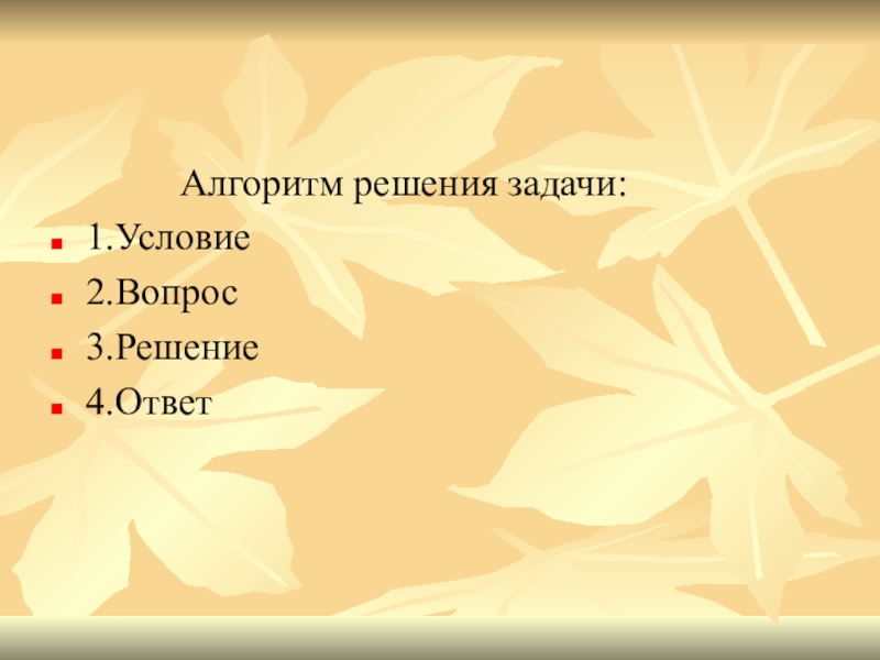 Алгоритм решения задачи:1.Условие2.Вопрос3.Решение4.Ответ