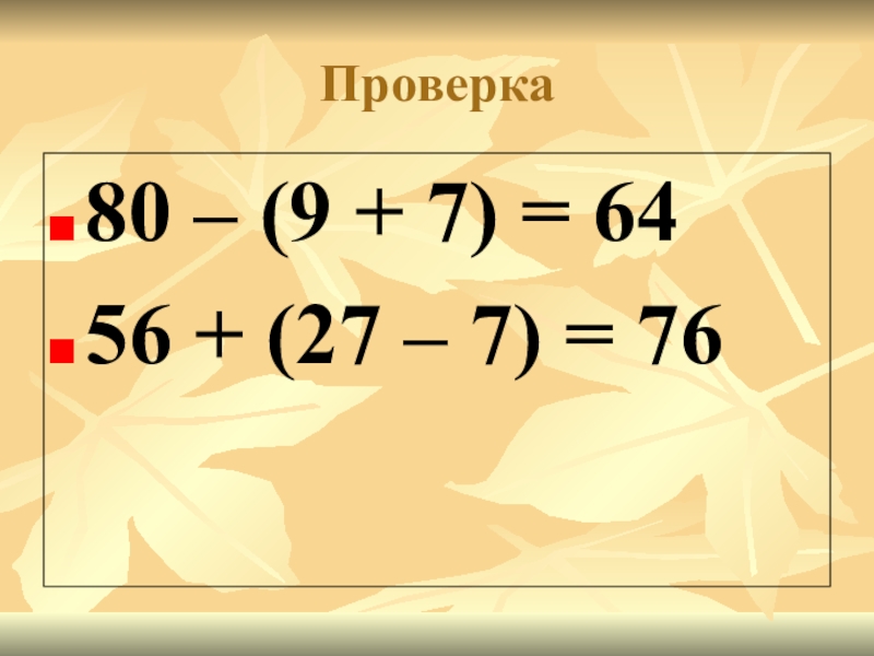 Проверка80 – (9 + 7) = 6456 + (27 – 7) = 76