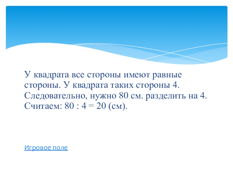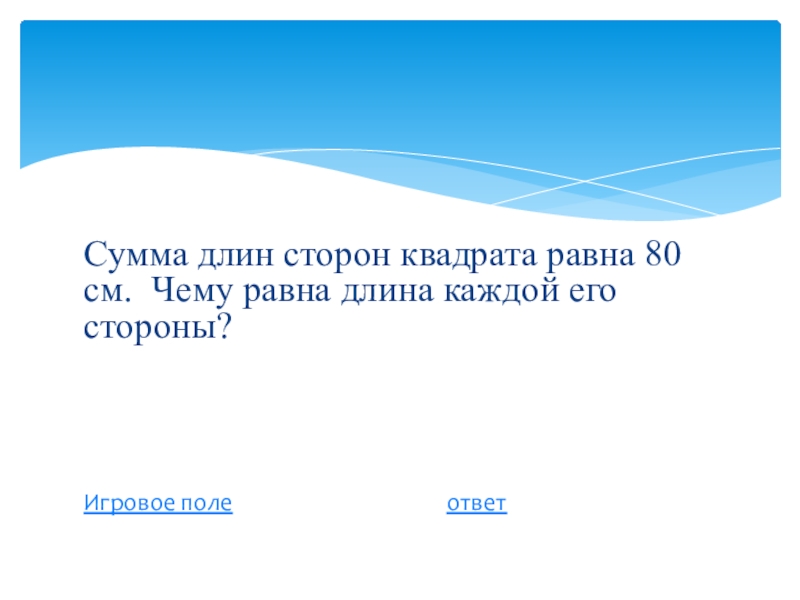 Слайд 21Сумма длин сторон квадрата равна 80 см. Чему равна длина каждой