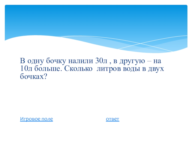 Слайд 39В одну бочку налили 30л , в другую – на 10л