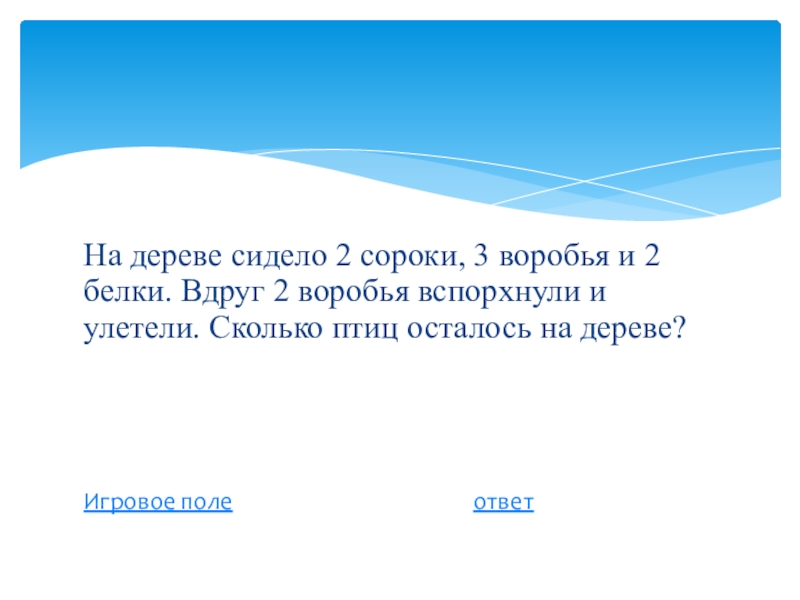 Слайд 17На дереве сидело 2 сороки, 3 воробья и 2 белки. Вдруг