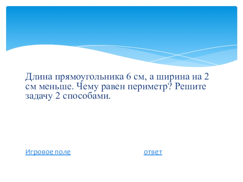 Слайд 25Длина прямоугольника 6 см, а ширина на 2 см меньше. Чему
