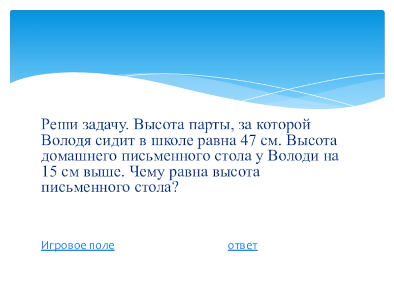 Слайд 37Реши задачу. Высота парты, за которой Володя сидит в школе равна