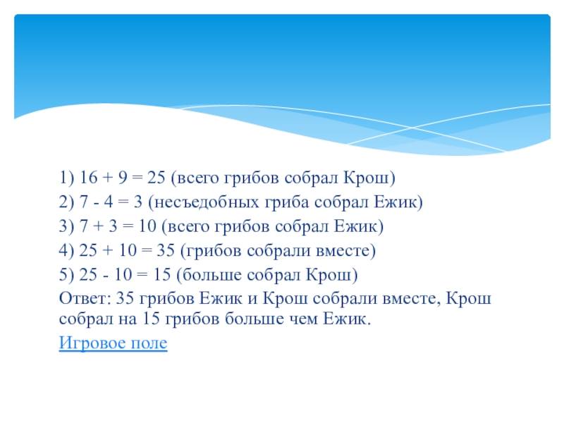 Слайд 101) 16 + 9 = 25 (всего грибов собрал Крош)